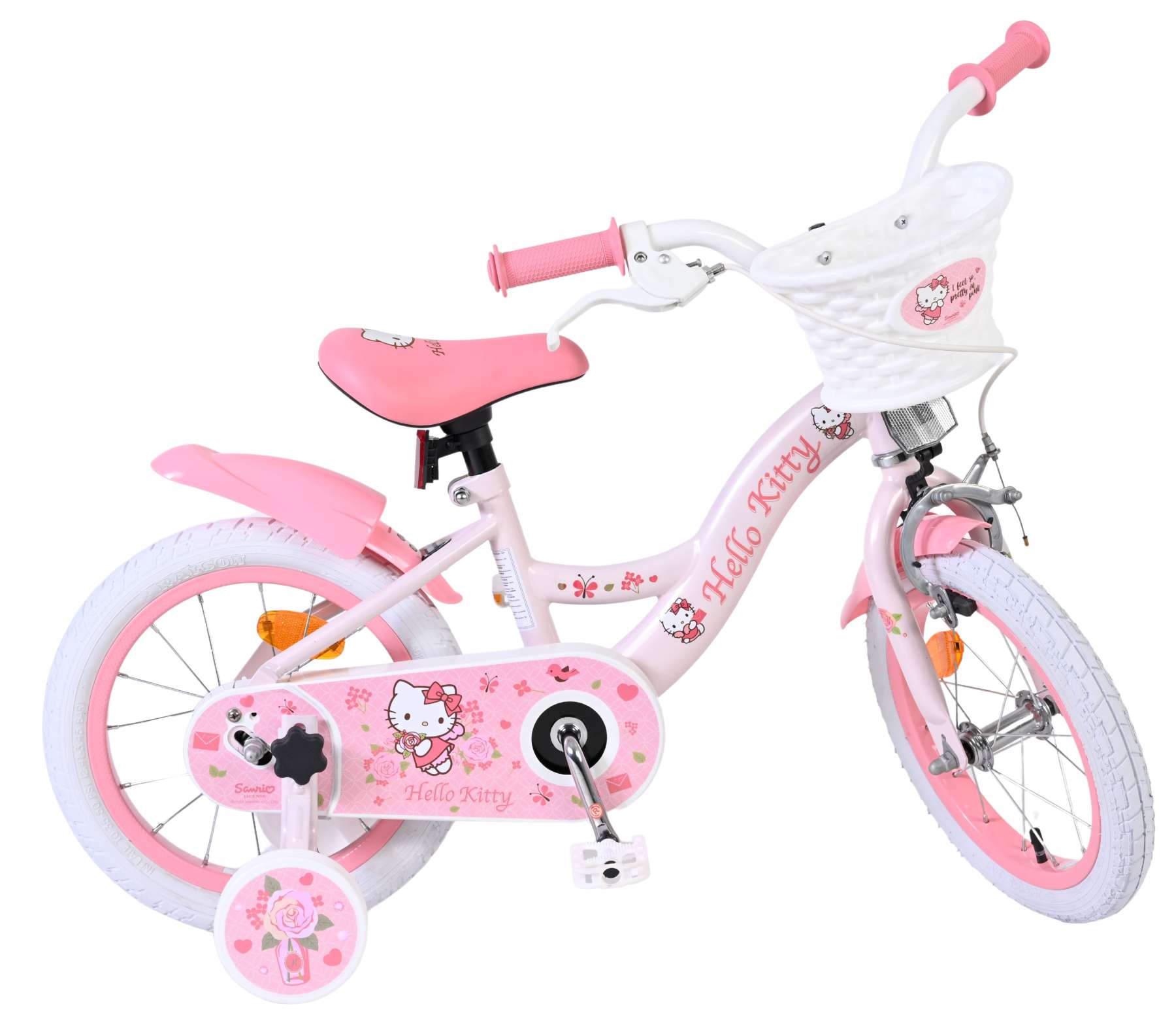Met de Volare Hello Kitty 14 inch kinderfiets in lichtroze wordt leren fietsen een feestje. Deze vrolijke fiets is ontworpen om jonge fietsers een veilige en comfortabele start te geven, met een stabiele en kindvriendelijke opbouw.
