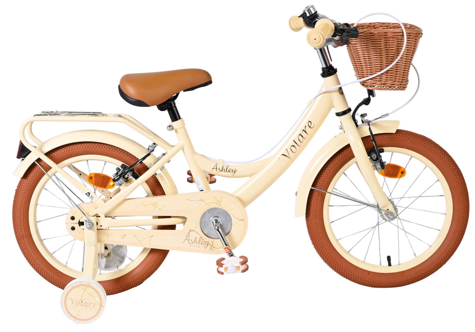 Ook aan gebruiksgemak is gedacht. Het mandje aan de voorkant is ideaal voor het meenemen van kleine spulletjes en de stevige achterdrager zorgt voor extra praktische mogelijkheden. Met zijn creme kleur en complete afwerking is de Volare Ashley 16 inch kinderfiets een fijne en betrouwbare keuze voor jonge fietsers.
