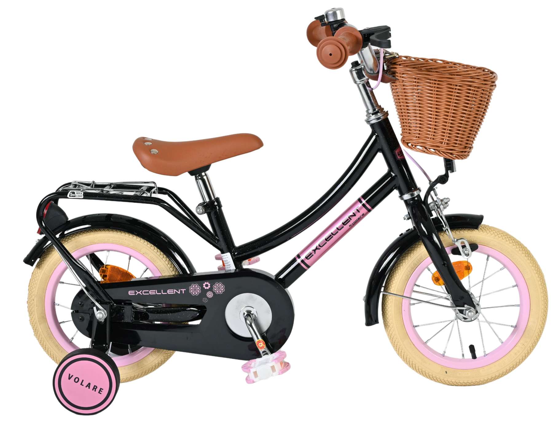 Veiligheid staat voorop! Daarom heeft deze gave fiets een handrem en terugtraprem, afneembare zijwieltjes en een gesloten kettingkast. Daarnaast heeft de fiets reflectoren achter en een leuke bel. Ook aan het comfort is gedacht. De mooie zwarte Volare fiets heeft een handige achterdrager, een comfortabel zacht zadel en een handig rieten mandje. Om zo lang mogelijk van de fiets te kunnen genieten zijn het zadel en stuur in hoogte verstelbaar. Wordt geleverd inclusief al het montagemateriaal dat nodig is om de fiets in elkaar te zetten!