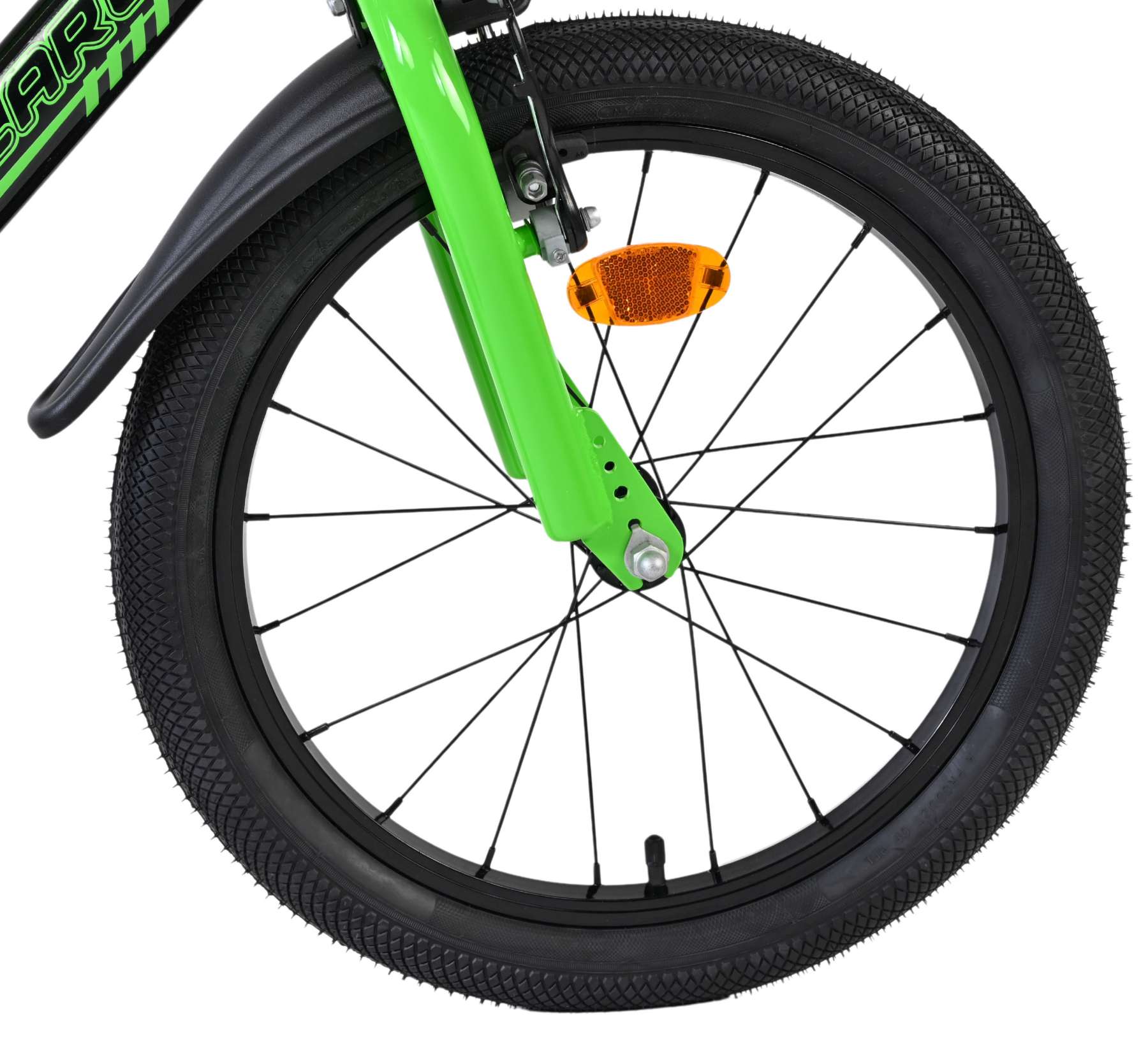 Veiligheid staat voorop! Daarom heeft deze gave fiets twee handremmen en geen terugtraprem! Het sterke stalen frame heeft met de stoere neon groen met zwarte kleurstelling een zeer sportieve uitstraling. Met de bidon in de praktische bidonhouder heeft uw kind altijd iets te drinken bij zich. De spatborden houden al het opspattend vuil tegen. Ter bescherming van de kleine vingertjes is de kettingkast gesloten. De fiets heeft zijwielen en een stevige standaard.